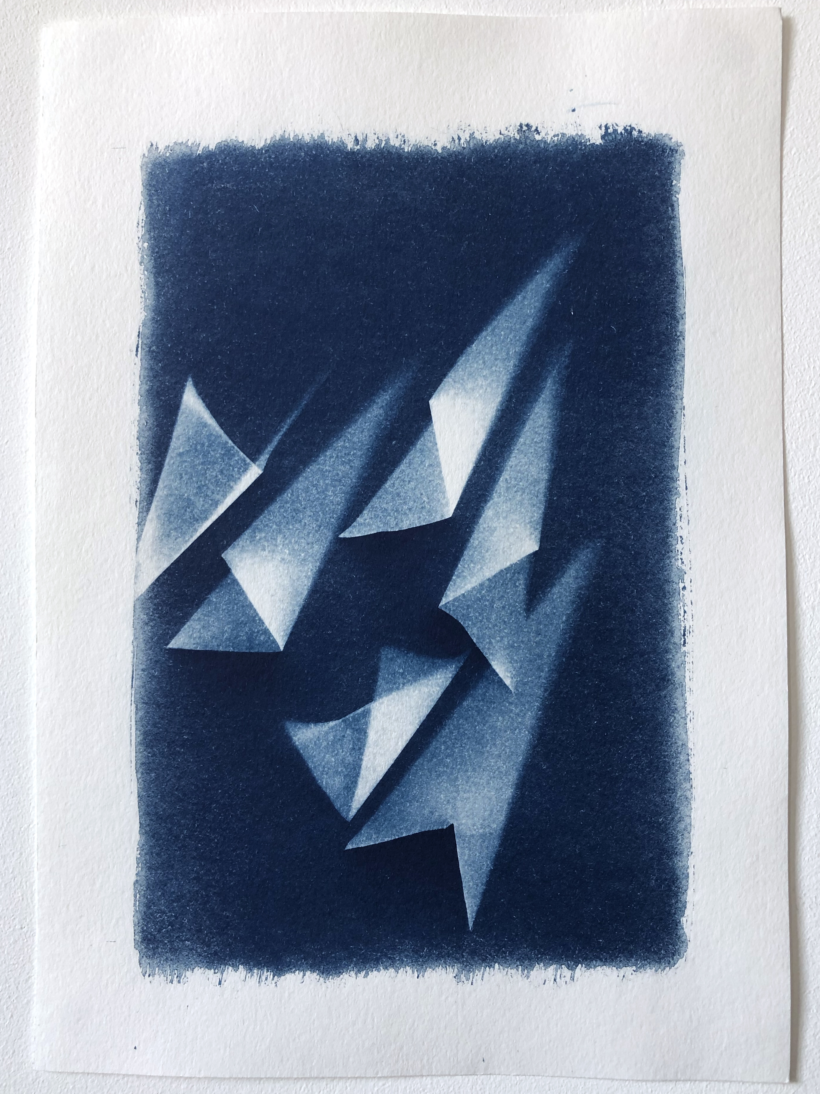 These photogram prints are made by placing strips and folded 3d shapes of tracing paper on the hand-coated cyanotype paper. All prints are unique.